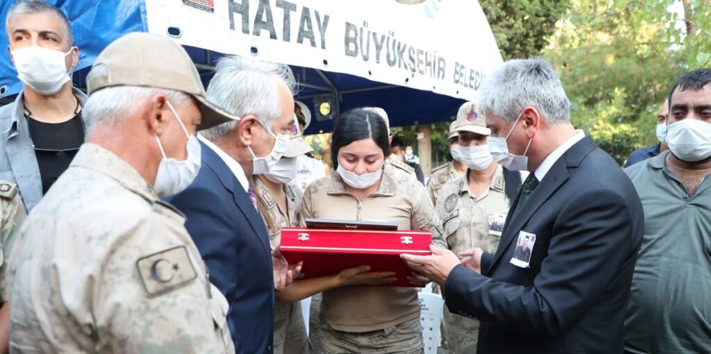 Beş kardeşten en küçüğü, 24 yaşında ve evli olan şehidimiz Jandarma Uzman Çavuş Hüseyin Yırtıcı’nın tabutunun sarılı olduğu Türk Bayrağı, şehidimizin babası Abdi Yırtıcı’ya, resmi ve Türk Bayrağı ise kendisinin askeri kamuflajını giyen eşi Hazal Yırtıcı’ya İçişleri Bakan Yardımcısı Mehmet Ersoy ve Hatay Valisi Rahmi Doğan tarafından sabır ve başsağlığı temennileriyle teslim edildi.