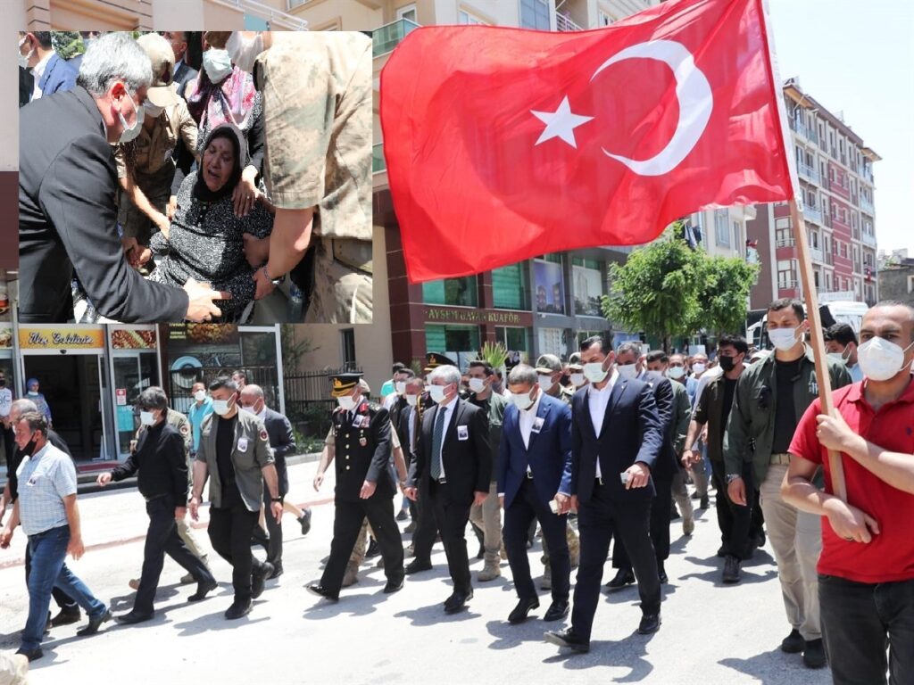 Henüz 29 yaşında ve bekâr olan şehidimiz Jandarma Uzman Çavuş Adil Yılmaz’ın resmi ve tabutunun sarılı olduğu Türk Bayrağını, şehidimizin kardeşi Mehmet Yılmaz’a sabır ve başsağlığı temennileriyle teslim eden Hatay Valisi Rahmi Doğan ardından şehidimizin annesi Fatma Yılmaz’a taziyelerini iletti.