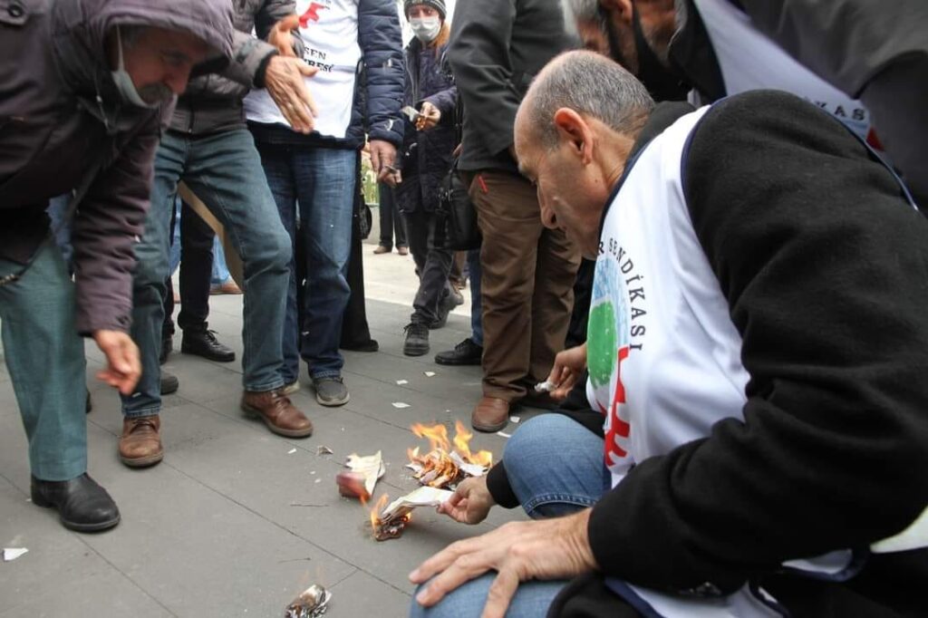 Sendikamız 2021 Tüm Emekliler Sendikası, ülke çapında kısa süre de hızla örgütlenerek, biz emeklilerin insanca ve onurlu bir yaşamı için ekonomik, demokratik mücadele örgütü olan sendika çatısı altında toplanıp, toplu sözleşmeli sendika hakkımızın kazanılması yolunda var gücüyle mücadelesini sürdürecektir diyerek artık ödeyemez hale geldiğimiz faturalarımızı sizlerin huzurunda yakıyoruz”