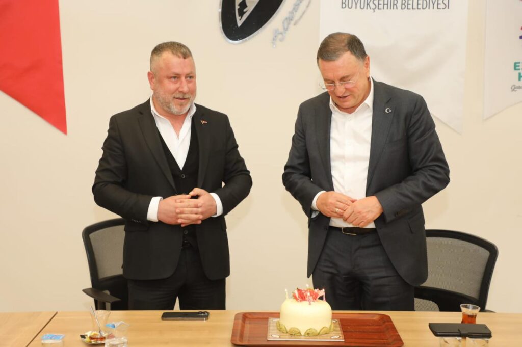 HBB Başkana ziyarette bulunan İGC’liler, Başkanın doğum günü olduğunu öğrenince Başkan Savaş’a pasta sürprizi yaptı.