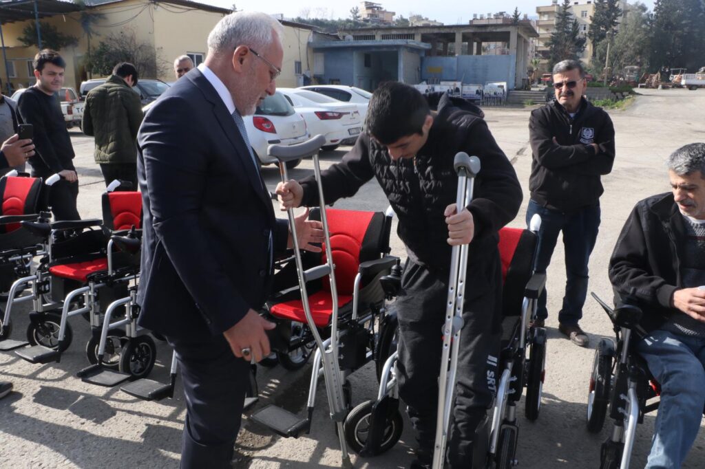 Belediye Başkanı Tosyalı, ulaşım müdürlüğü önündeki açık alanda düzenlenen programda, İskenderun Belediyesinden talepte bulunan engelli vatandaşlara akülü tekerlekli araç desteğinde bulundu.