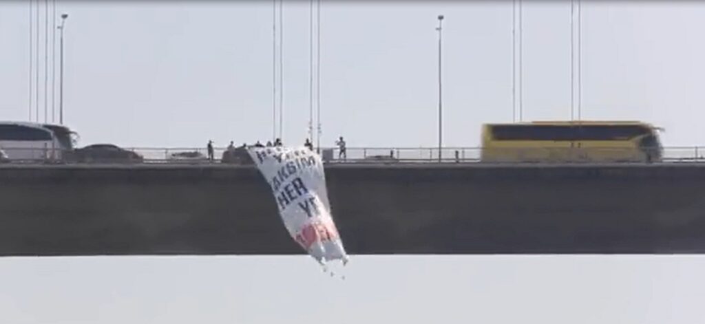 Türkiye İşçi Partisi (TİP) Genel Başkanı Erkan Baş ve TİP Milletvekilleri Sera Kadıgil ile Ahmet Şık, Gezi Direnişi’nin 9. yılında İstanbul’daki Boğaziçi Köprüsü’nden pankart sallandırdı.