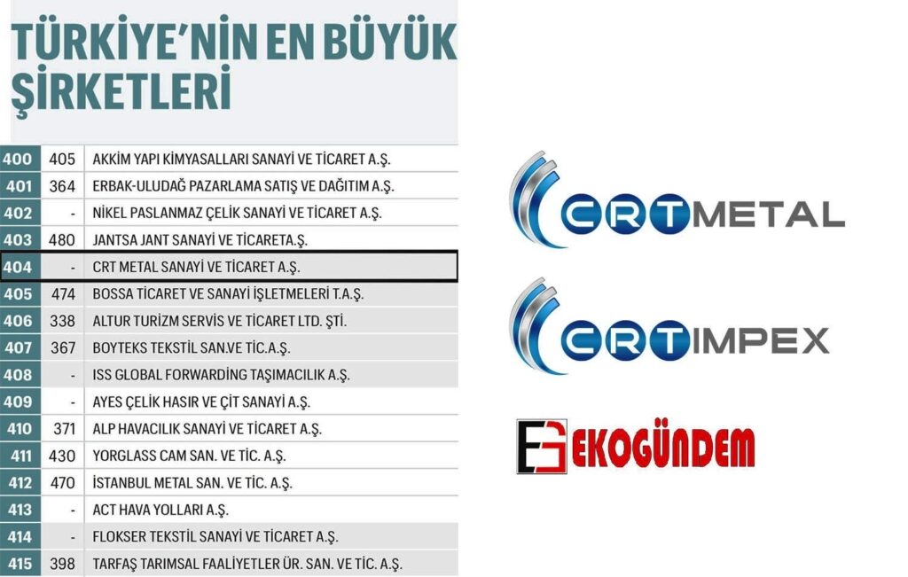 Türkiye’nin en büyük 500 şirketini belirleyen ‘Fortune 500 Türkiye Araştırması’nda CRT METAL SANAYİ VE TİCARET A.Ş. Listeye 404. Sıradan giriş yaptı.