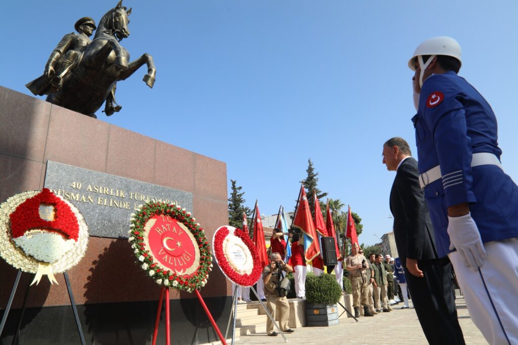 Antakya Cumhuriyet Meydanı Atatürk Anıtı önünde düzenlenen tören çelenklerin sunulması ile başladı. Başkomutan Gazi Mustafa Kemal Atatürk ve tüm şehitlerimizin aziz hatırası için saygı duruşu ve İstiklal Marşı’nın okunmasının ardından Vali Doğan 30 Ağustos Zafer Bayramı mesajını okudu.