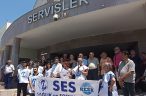 İskenderun Devlet Hastanesi ana bina girişinde, Sağlık ve Sosyal Hizmet Emekçileri Sendikası (SES)…