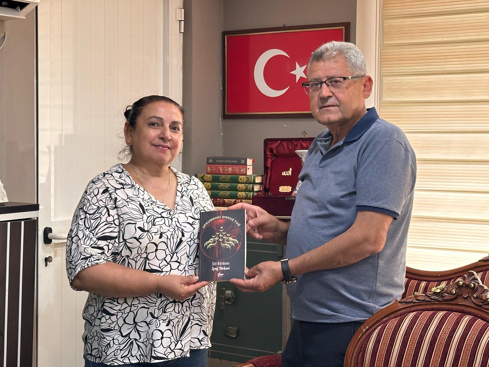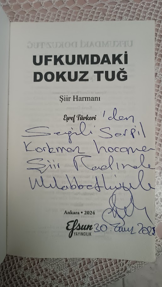 İskenderun’un tanınmış yazar ve halk şairlerinden Eşref Türkeri, yeni yayımlanan Ufkumdaki Dokuz Tuğ adlı şiir kitabını gazeteci Serpil Korkmaz için imzaladı. Türkeri, kitabını “Eşref Türkeri’nden sevgili Serpil Korkmaz hocama, şiir tadında muhabbetleri ile…” notuyla armağan etti.