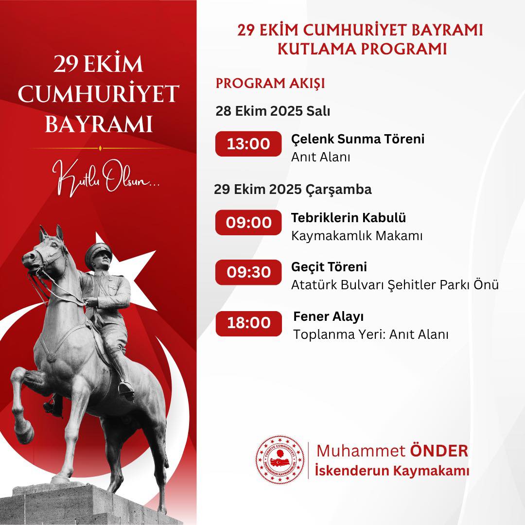 İskenderun Kaymakamlığı, Cumhuriyetimizin 102. yıl dönümü dolayısıyla düzenlenecek 29 Ekim Cumhuriyet Bayramı kutlama programını açıkladı.