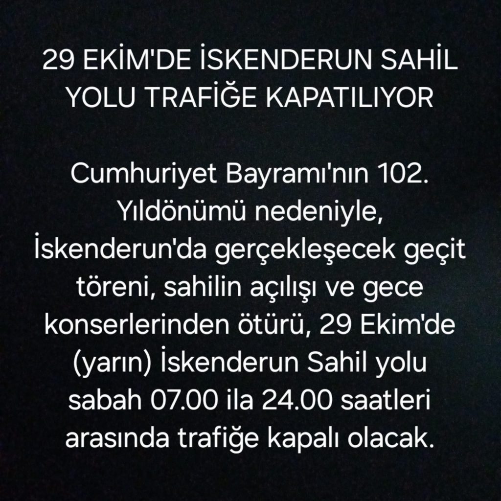 Cumhuriyet Bayramı’nın 102. yılı kutlamaları kapsamında İskenderun’da yoğun bir program gerçekleştirilecek. Kutlamalar nedeniyle, 29 Ekim Salı günü İskenderun Sahil Yolu sabah 07.00’den gece 24.00’e kadar araç trafiğine kapatılacak.