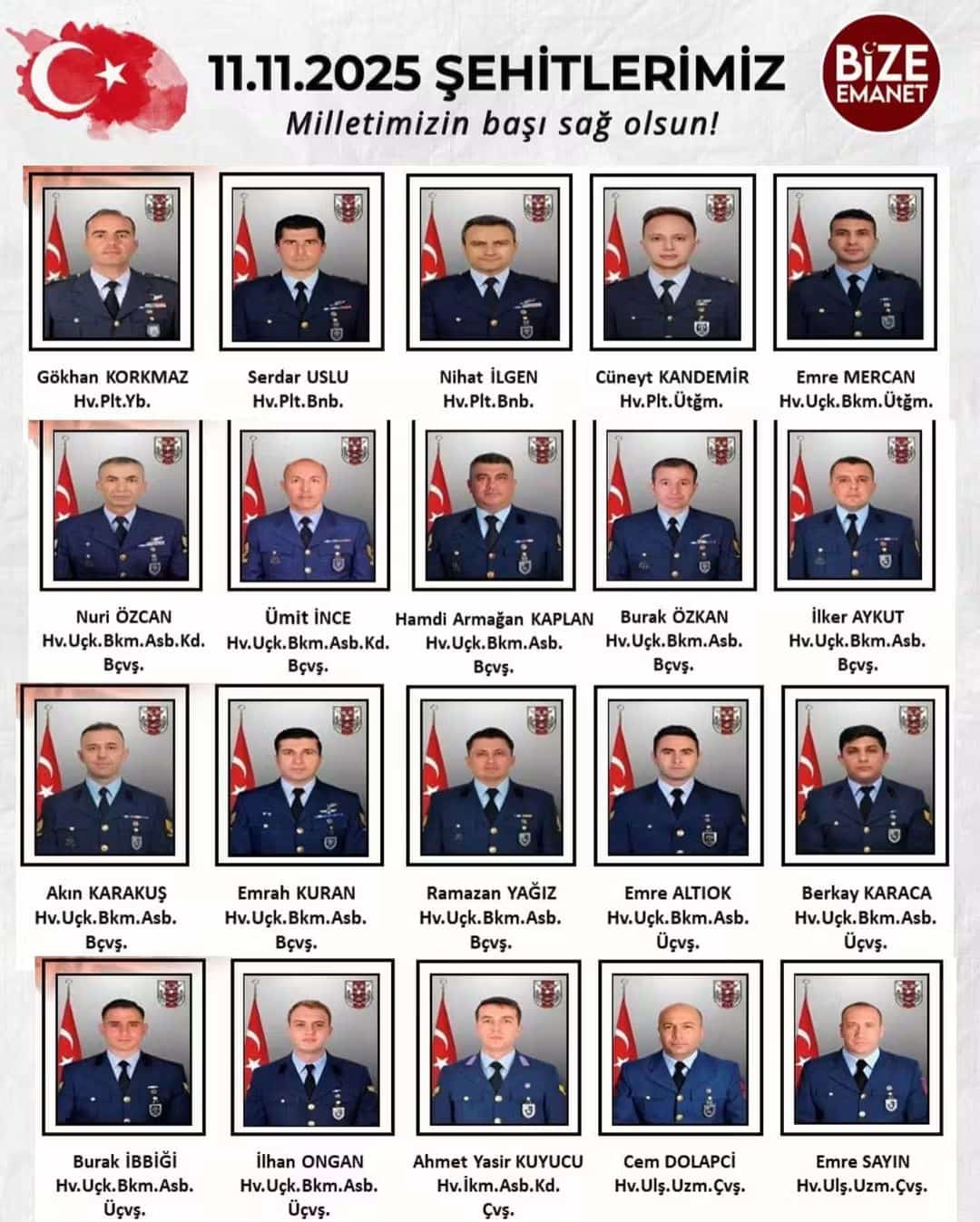 Milli Savunma Bakanlığı, dün Azerbaycan’dan havalanan ve Gürcistan-Azerbaycan sınırında düşen C-130 tipi askeri kargo uçağında şehit olan 20 kahraman askerimizin kimlik bilgilerini resmi sosyal medya hesabından paylaştı.