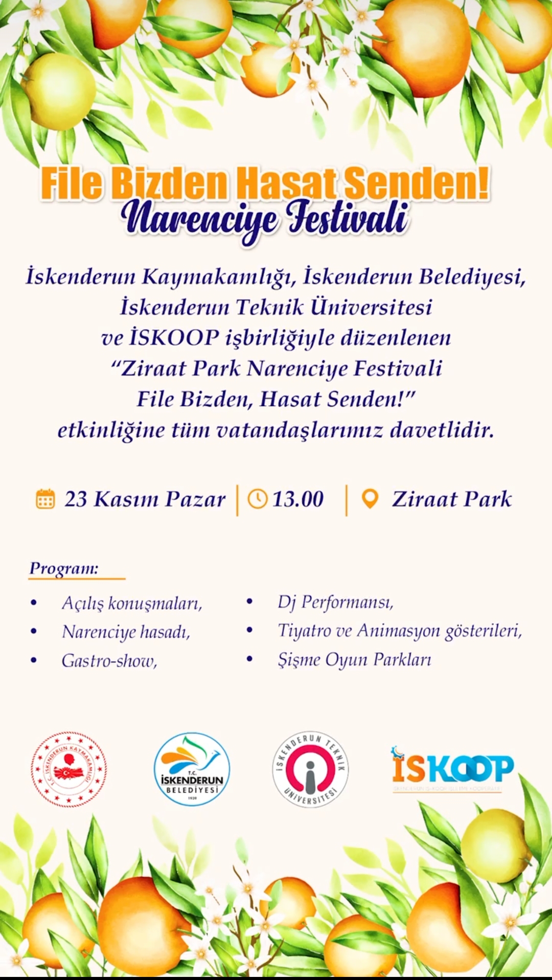 İskenderun Kaymakamlığı, İskenderun Belediyesi, İskenderun Teknik Üniversitesi (İSTE) ve İSKOOP iş birliğiyle düzenlenen “File Bizden Hasat Senden – Ziraat Park Narenciye Festivali” için geri sayım başladı. Kentin tarımsal değerlerini ön plana çıkarmayı amaçlayan festival, 23 Kasım 2025 Pazar günü saat 13.00’te Ziraat Park’ta gerçekleştirilecek.