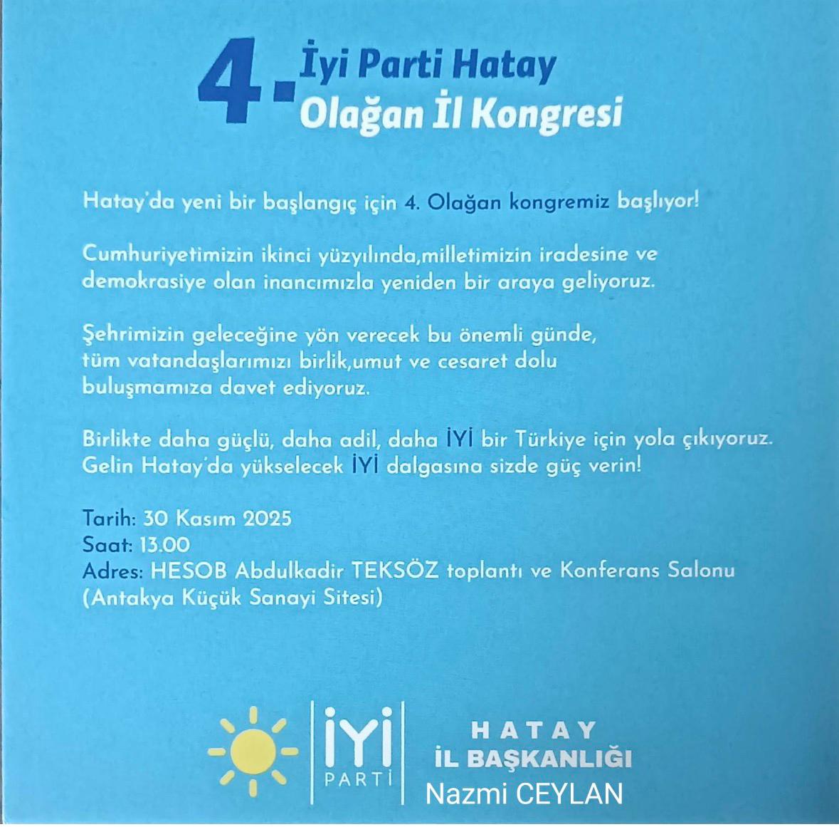 Kongre davet metninde, kentin geleceğine yön verecek bu önemli buluşmada tüm vatandaşlara birlik, umut ve cesaret çağrısı yapıldı. İYİ Parti Hatay İl Başkanlığı, daha güçlü, daha adil ve daha iyi bir Türkiye hedefiyle yola çıktıklarını belirterek, “Gelin Hatay’da yükselecek İYİ dalgasına siz de güç verin” mesajını paylaştı.
