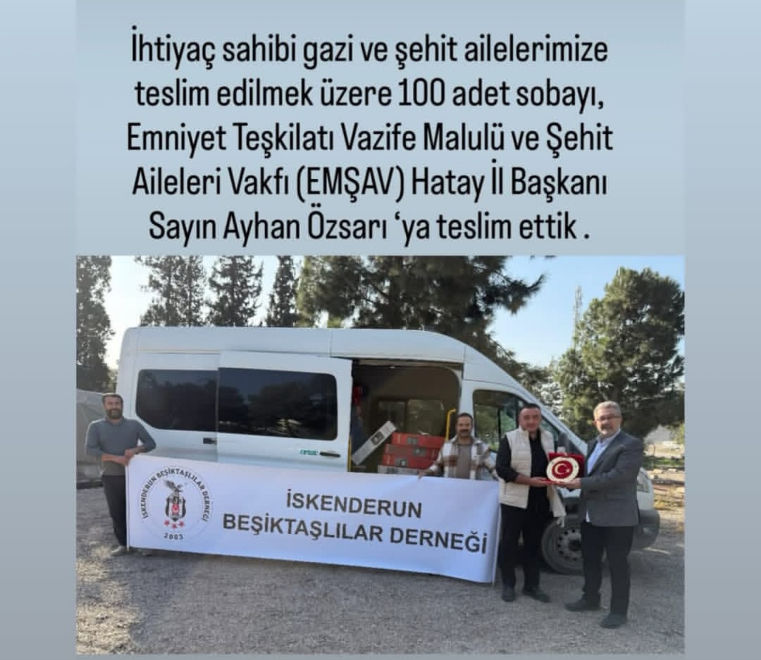 İskenderun Beşiktaşlılar Derneği, ihtiyaç sahibi gazi ve şehit ailelerine ulaştırılmak üzere temin edilen 100 adet sobayı, Emniyet Teşkilatı Vazife Malulü ve Şehit Aileleri Vakfı (EMŞAV) Hatay İl Başkanlığına teslim etti.