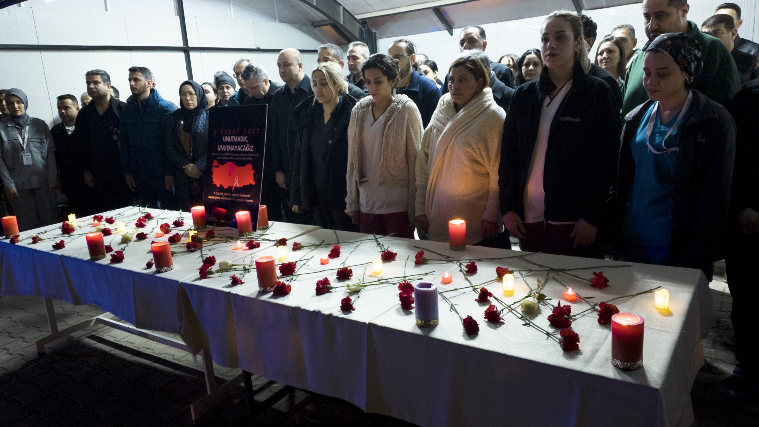 Saatler 04.17’yi gösterdiğinde, depremin başladığı o acı anda; sağlık çalışanları ve vatandaşlar saygı duruşunda bulunarak yaşamını yitirenleri andı. Ardından, kaybedilen canların anısına hazırlanan platforma karanfil bırakıldı.