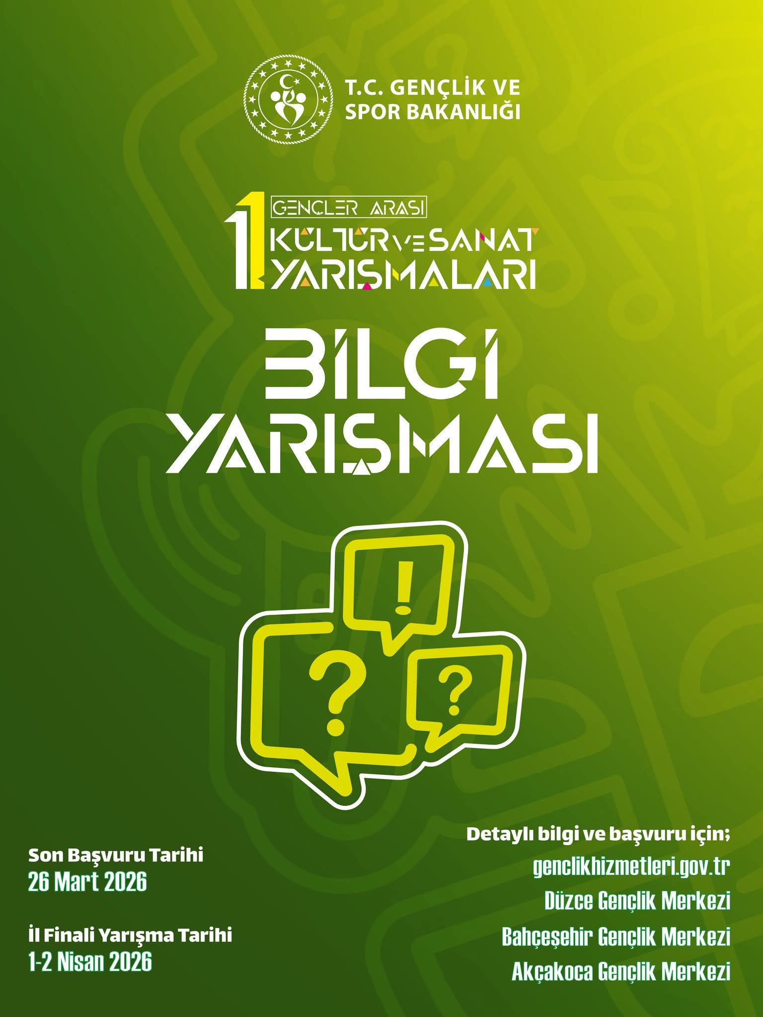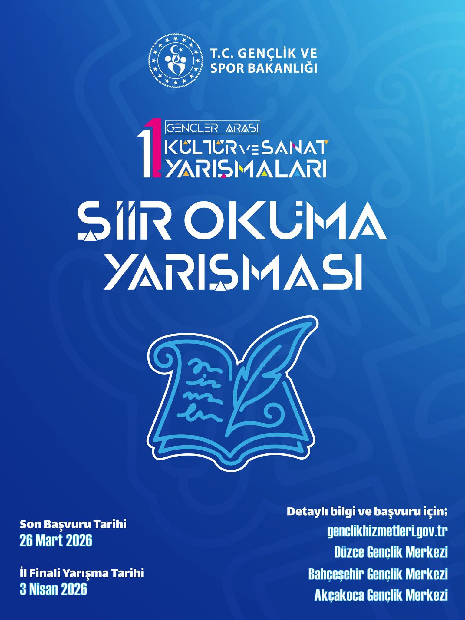 Gençlerin kültür ve sanat alanındaki üretimlerini desteklemek, yeteneklerini görünür kılmak ve gençlerin sanatsal ifade becerilerini geliştirmelerine imkân sağlamak amacıyla 2026 Yılı Gençler Arası Kültür ve Sanat Yarışmaları düzenlenmektedir. Yarışmalar; gençlerin şiir, tiyatro, müzik ve bilgi alanlarında kendilerini ifade edebilecekleri güvenli ve teşvik edici bir ortam sunarken, gençlik merkezleri aracılığıyla illerden Türkiye finallerine uzanan çok aşamalı bir süreçle katılımcılara deneyim kazanma fırsatı sağlar. Bu organizasyonla birlikte gençlerin kültürel paylaşımlarının artırılması, sosyal etkileşimlerinin güçlendirilmesi ve gençlerin sanat yoluyla toplumsal yaşama aktif katılımlarının desteklenmesi hedeflenmektedir.