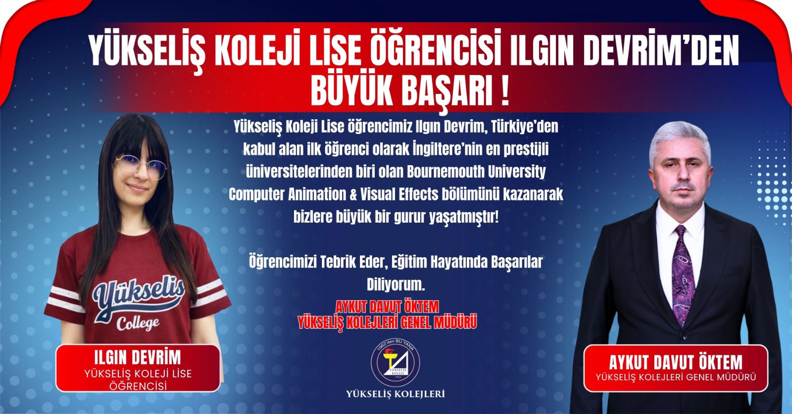 Yükseliş Koleji lise öğrencisi Ilgın Devrim, gösterdiği üstün akademik başarıyla 2019 yılından bu yana Türkiye’den kabul alan ilk öğrenci olarak İngiltere’nin saygın yükseköğretim kurumlarından Bournemouth University’nin Computer Animation & Visual Effects bölümüne kabul edilmiştir.