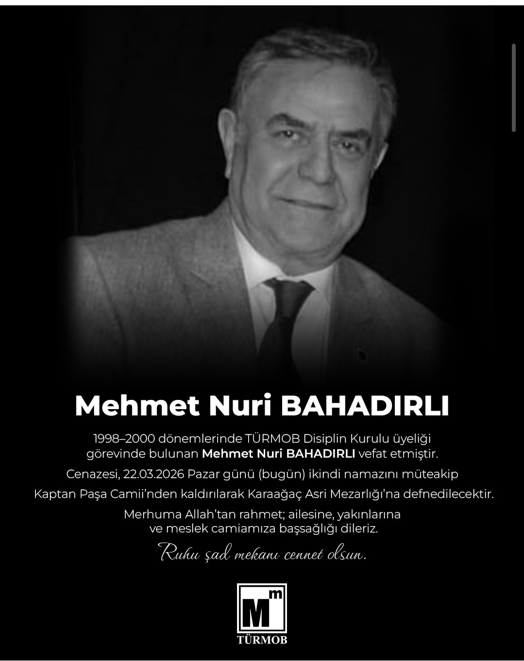 TÜRMOB tarafından yapılan açıklamada, Bahadırlı’ya Allah’tan rahmet, ailesine, yakınlarına ve meslek camiasına başsağlığı dilekleri iletildi.