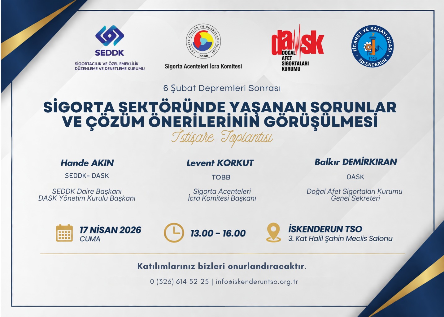 “06 Şubat Depremleri Sonrası Sigorta Sektöründe Yaşanan Sorunlar ve Çözüm Önerilerinin Görüşülmesi” konulu toplantı düzenlenecektir.