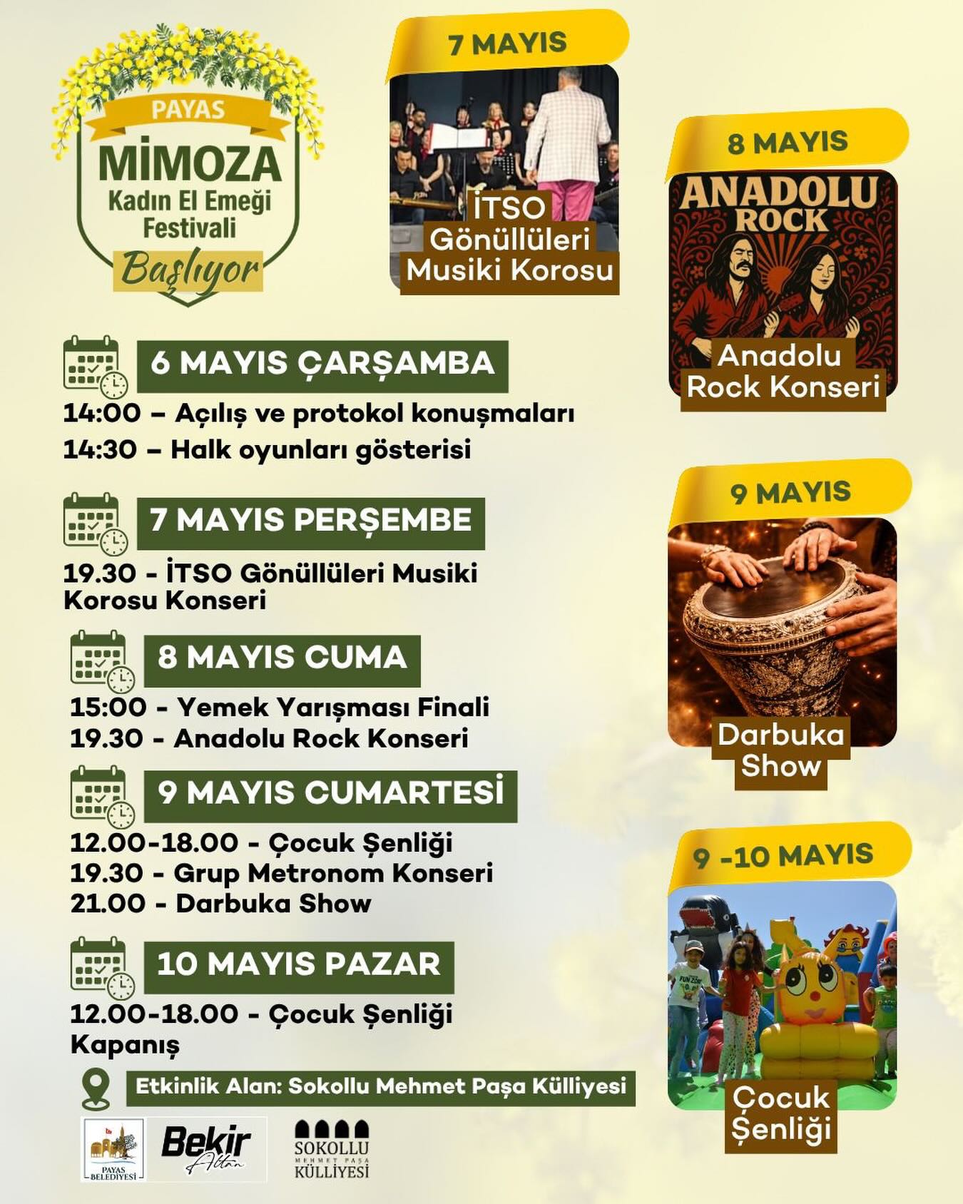 Payas’ta baharın en güzel habercilerinden mimoza çiçekleriyle birlikte renkli bir festival başlıyor. Kadın emeğini, kültürel değerleri ve eğlenceyi bir araya getiren Payas Mimoza Kadın El Emeği Festivali, 6–10 Mayıs tarihleri arasında ziyaretçilerini ağırlamaya hazırlanıyor.