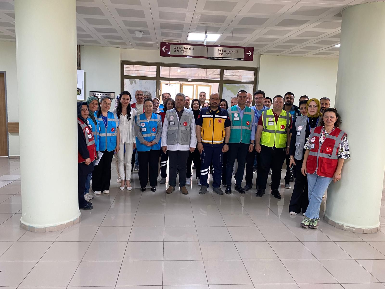 Başhekim Dr. Adem Sarı’nın öncülüğünde gerçekleştirilen programa, İl Sağlık Müdürlüğü’nden gelen uzman ekip ile hastane yönetimi katıldı. İl Sağlık Müdürlüğü’nün koordinasyonunda yürütülen çalışmalarda, afetlere hazırlık sürecinde kurumlar arası iş birliği ve planlı hareket etmenin önemi bir kez daha ortaya kondu.
